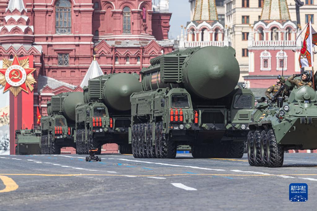 5月7日,在俄罗斯首都莫斯科,“亚尔斯”导弹系统编队驶过红场。新华社记者 白雪骐 摄