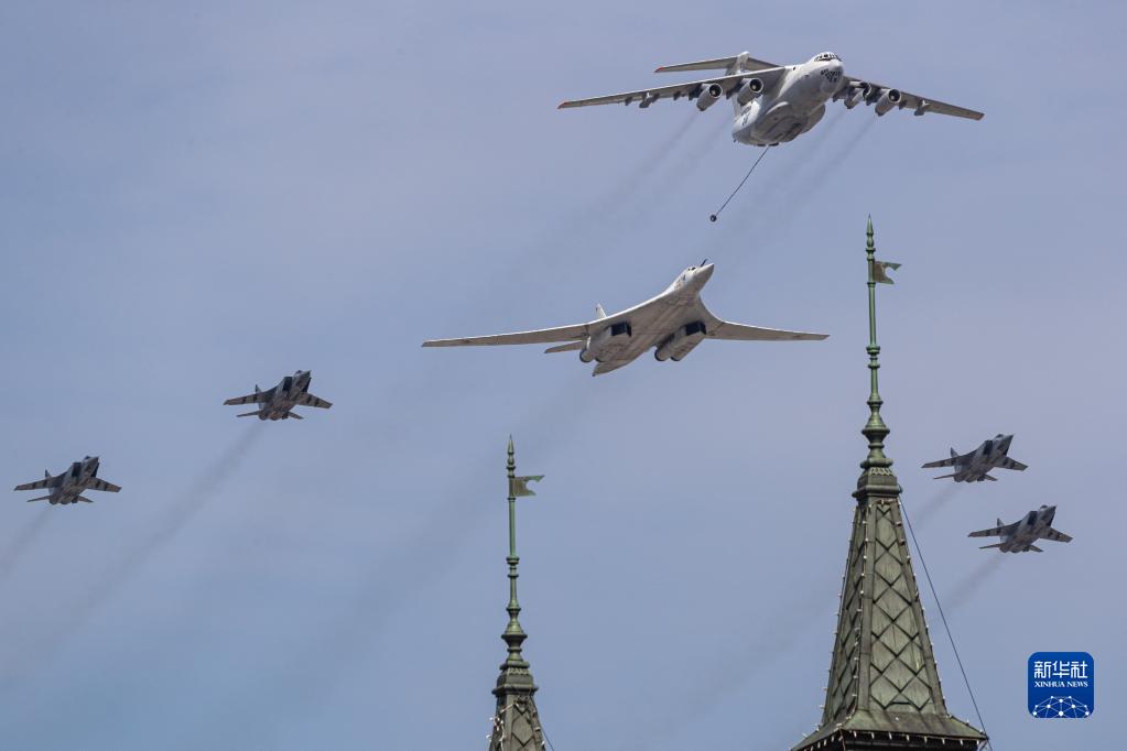5月7日,在俄罗斯首都莫斯科,米格-31战机、图-160战略轰炸机、伊尔-78空中加油机(从后至前)编队飞过红场上空。新华社记者 白雪骐 摄