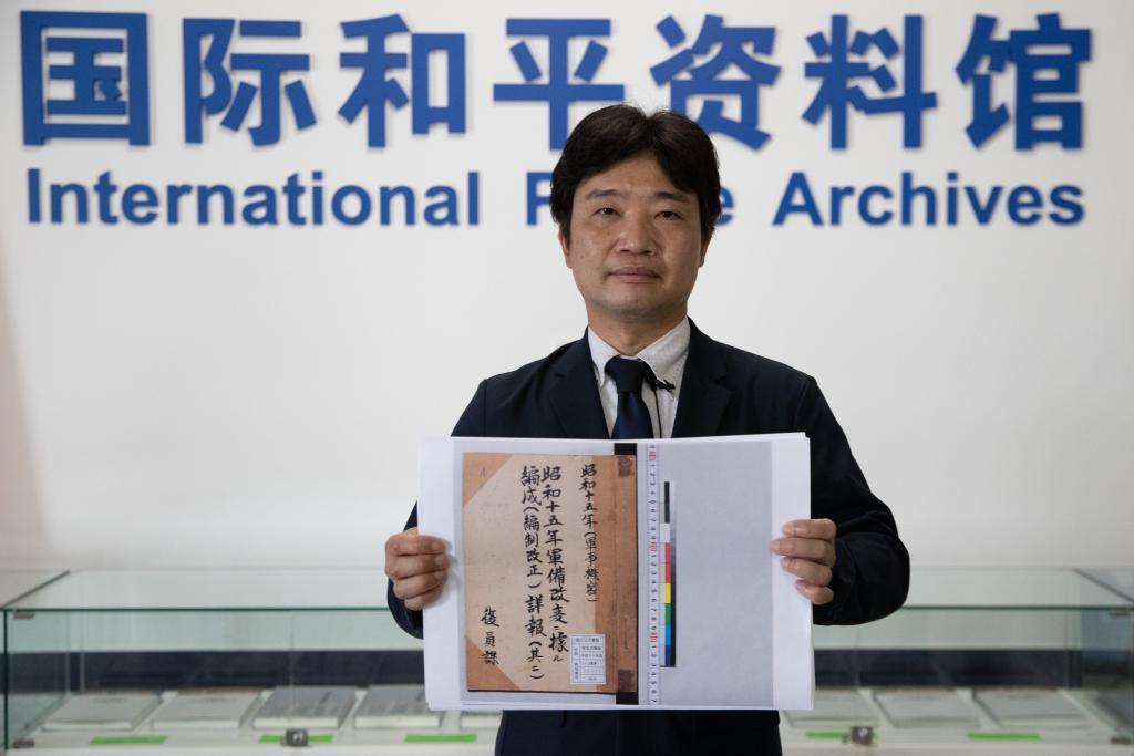 6月1日,在黑龙江外国语学院国际和平资料馆,日本学者松野诚也展示新发现的资料。此前,黑龙江外国语学院和侵华日军第七三一部队罪证陈列馆联合在哈尔滨市向社会公布了一批部队编制资料。这些资料包括关东军防疫给水部军官高等文官职员表、判任文官同待遇者职员表等。新华社记者张涛摄