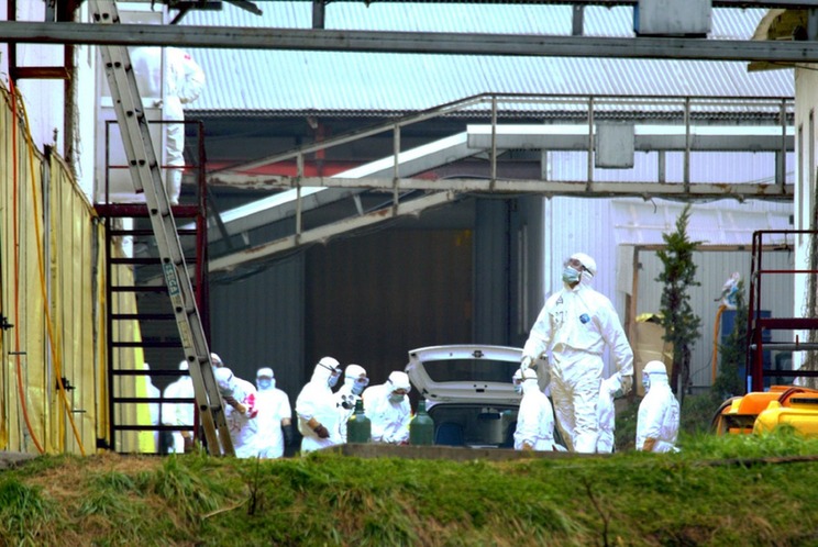 2004年2月29日,日本防疫人员在发生禽流感的京都府丹波町的养鸡场内准备扑杀活鸡。新华社记者冯武勇摄
