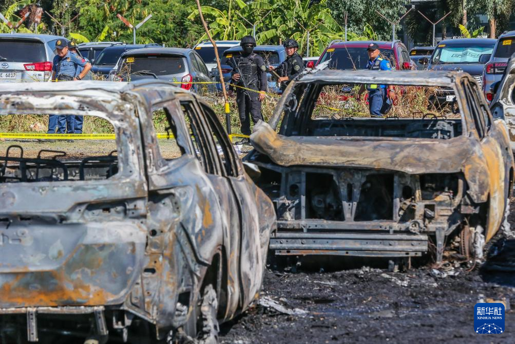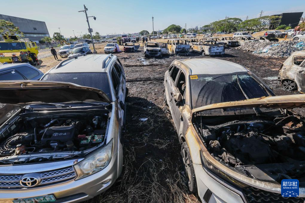 这是4月22日在菲律宾尼诺伊·阿基诺机场的一处停车场拍摄的被烧毁的车辆。