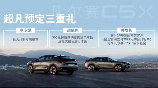 现在预定,还可享受“超凡预定三重礼”。其中,享专属礼可获得私人订制专属徽章;超值购礼将获得500元超值选购高级黑色车顶及轻质铝合金行李架的权益。共成长礼,凡支付2999元的预定客户和前期支付2999元的盲订客户,都将自动成为凡尔赛C5 X成长基金会员。东风雪铁龙在凡尔赛C5 X上市之日起一年内,每卖出一台凡尔赛C5 X,都将与成长基金会员分享5000积分(东风雪铁龙官方小程序)。凡尔赛C5 X销量越高,客户收益越多,东风雪铁龙愿与首批凡尔赛C5 X车主共成长。