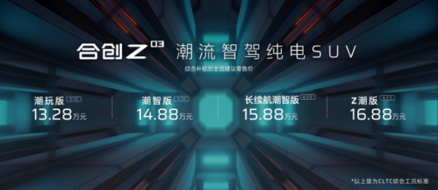 此次,合创Z03共推出四大版本,潮玩版CLTC工况续航里程达到510km,补贴后售价为13.28万元;潮智版增配了H-VIP智驾互联系统,补贴后售价为14.88万元;潮智长续航版的CLTC工况续航里程为620km,补贴后售价为15.88万元;顶配Z潮版拥有更强大动力表现,并增配了540°全透明底盘、主副驾全电动功能座椅等,补贴后售价为16.88万元。未来,合创Z03还将推出可以选装800km续航超大容量电池包的EDG特别定制版。