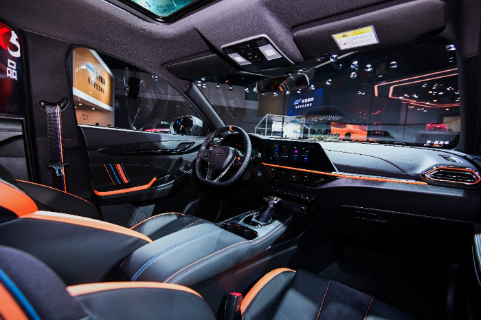 在中控台、空调出风口、车门等处都能采用了橙色炫彩纹饰,以橙色为主色调,辅以蓝色点缀,更加动感时尚;运动方向盘回正标,保证驾驶时能够时刻精准让方向盘回正;熏黑的运动顶棚,采用了大多数极致运动SUV的设计风格。