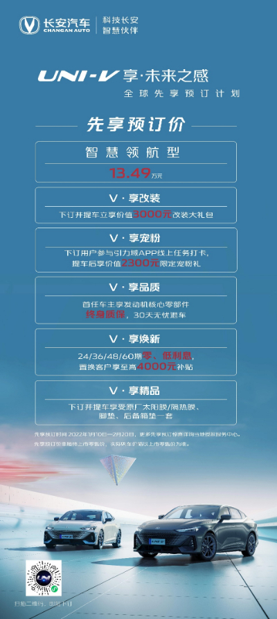 多年来,长安始终坚持“以客户为中心”,为实现用户美好自由的出行生活而努力。在UNI-V全球先享预订计划中,长安推出V·享改装、V·享宠粉、V·享品质、V·享焕新、V·享精品等一系列先享预订专属礼遇,涵盖从购车到用车的各个环节,将全方位降低用户的购车成本,大幅提升用车时的舒适度。