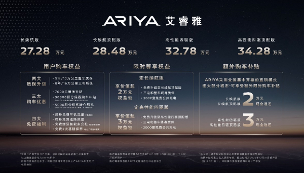9月27日,东风日产ARIYA艾睿雅举行上市发布会。NISSAN NEXT首款全球战略车型ARIYA艾睿雅在中国市场正式上市,新车共分为四个级别,市场指导价为27.28万元-34.28万元,其中,长续航版27.28万元,长续航顶配版28.48万元,高性能四驱版32.78万元,高性能四驱顶配版34.28万元。首批新车将于10月正式交付用户。