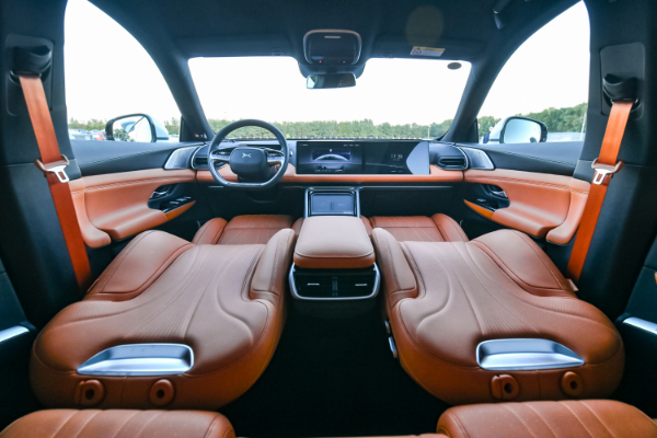 车内大面积采用软性材质包裹,触感上乘。中控台的两块大屏尺寸均为14.96英寸,分辨率为2400*1200dpi,可支持分屏操控,得益于高通骁龙SA8155P芯片,较强的算力能够保证车机系统流畅运行,可以全车全时人机对话,无需唤醒词,且支持无网状态下使用。