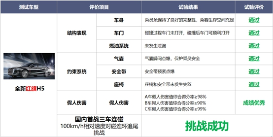 综上所述,通过中汽中心这场叠加碰撞测试,我们能够看到全新红旗H5所拥有的扎实表现,也验证了全新红旗H5以及红旗品牌在对于车身安全以及汽车出行的安全水平所具备的实力和认知,更相应的满足消费者对于行车安全性的考量和用车需求。