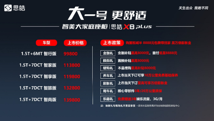 11月20日,思皓乘用车—思皓X8 PLUS正式上市。该车共5款车型,官方指导价9.98万元-13.98万元。