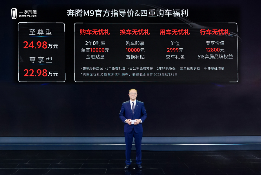 为了让更多消费者能轻松享受奔腾M9的全能体验,发布会上,一汽奔腾轿车有限公司销售分公司副总经理丁健还正式发布四重购车福利,全面降低消费者在购车、换车、用车、养车阶段的成本支出。购车无忧礼,下订即可尊享10000元金融购车免息支持;换车无忧礼,增换购车主下订直享10000元置换补贴;用车无忧礼,独享价值2999元交车礼包;行车无忧礼,专享整车终身质保、百公里免费救援、5年免费机油等价值12800元的518品牌权益礼包。