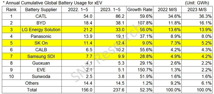 相较于SNE Research今年2月发布的 2022年1-12月行业报告,比亚迪在本次排行榜中上升至第二名。2023 年 1 -5 月,比亚迪装机量达38.1GWh,较去年同期提升107.8%,市场份额增长超1/3,达16.1%。韩国厂商 LG 能源则以 13.9% 的市场份额退居第三。报告分析,比亚迪电池在价格方面具有较强竞争力,且旗下 Atto 3(元 PLUS 海外版)车型在亚、欧地区持续扩大市场份额,助使比亚迪电池份额实现爆发式增长。
