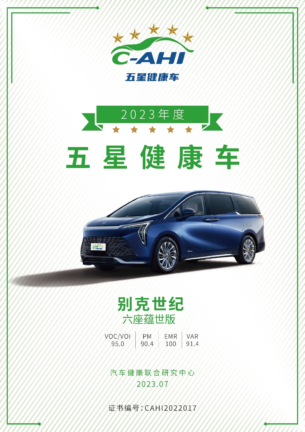 别克世纪CENTURY获颁中汽研“五星健康车”认证
