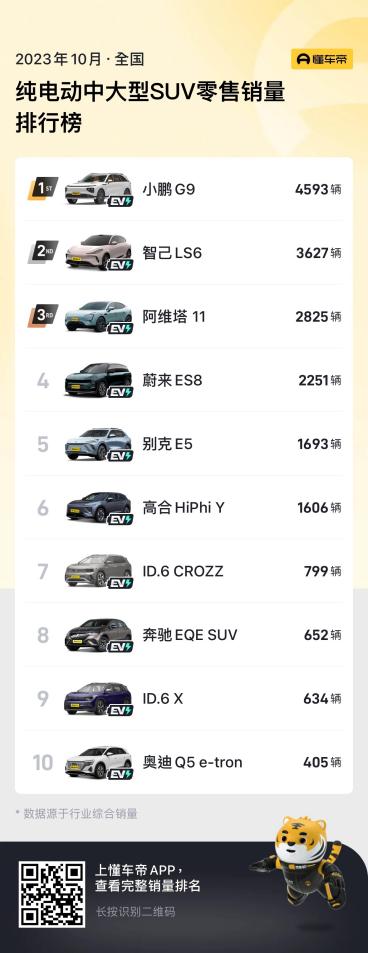 11月13日,小鹏汽车通过其官方微博宣布,小鹏G9在10月份以4,593台的销售表现位列中大型纯电SUV销量榜首,并且连续四周保持销量第一,其中智驾高配的MAX版本占比达80%。