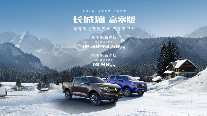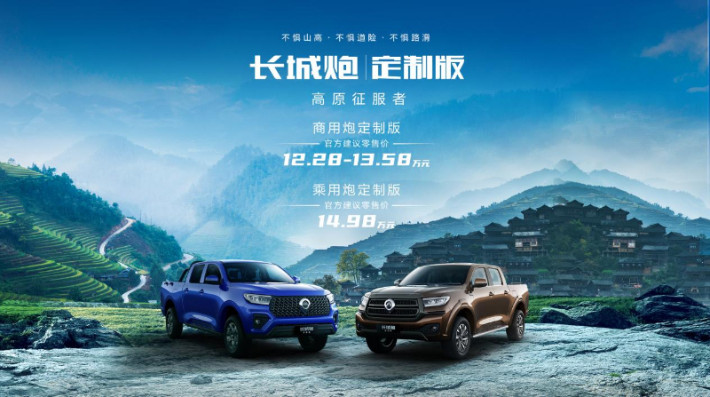 长城炮定制版是专为高原山区用户打造的专属皮卡,以“不惧山高”、“不惧道险”、“不惧路滑”的硬核实力,打造高原征服者的驾乘新体验。长城炮高寒版是基于北方高寒地区用户需求及用车场景打造的专属车型,以“无畏天寒”、“无畏地冻”、“无畏冰雪”的硬核实力,打造严冬守卫者的驾乘新体验。