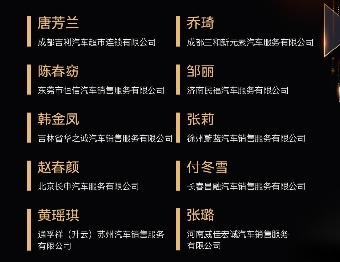 作为2023(第十八届)中国汽车金扳手奖评选的同期活动,2023全国十佳金扳手续保专员评选旨在让经销商更加重视续保这一有效降低客户流失的重要举措,进而增加经销商的盈利和服务能力,同时展示续保专员的技能风采。该评选采用抖音点赞、线上答题、行业专家评审的形式,多轮次、多角度对选手们做出专业、全面、准确的考核。经过层层严格选拔,最终来自10个品牌的10位续保专员从中脱颖而出,获得2023全国十佳金扳手续保专员荣誉称号。