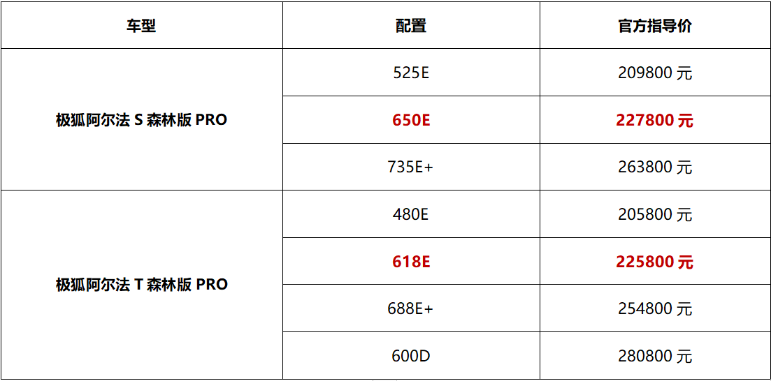 1月25日,极狐汽车旗下阿尔法S/T森林版PRO整体在原森林版基础上,围绕前后排座椅加热/按摩、真皮方向盘、热泵空调等豪华、舒适性配置进行多维升级,同时还新增了阿尔法S森林版PRO 650E、阿尔法T森林版PRO 618E,官方指导价分别为22.78万元、22.58万元。