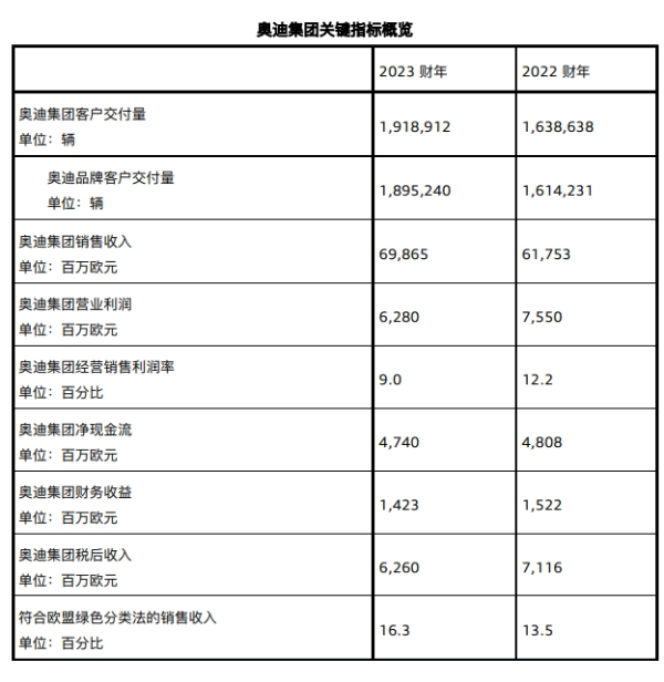 2023财年,奥迪集团的财务收益为14.23亿欧元(2022财年:15.22亿欧元),其中中国市场业务贡献9.15亿欧元(2022年:11.53亿欧元)。税后收入为62.60亿欧元(2022财年:71.16亿欧元)。