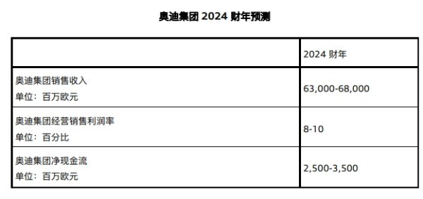 在经济保持一定增长且零部件供应稳定的情况下,奥迪集团预计2024财年的销售收入将在630亿至680亿欧元区间内,经营销售利润率预计在8%至10%,净现金流将在25亿至35亿欧元之间。