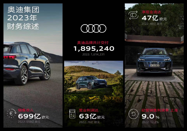 北京时间3月19日晚,奥迪集团召开了年度新闻发布会。据发布会介绍,奥迪集团在2023财年取得稳健发展,销售收入增长13.1%,达到699亿欧元;营业利润为63亿欧元,经营销售利润率为9%;净现金流几乎与去年持平,达到47亿欧元。未来几年,奥迪将通过推出众多新车型,进一步强化并丰富产品组合。随着首款基于全新PPE豪华纯电动平台的纯电动车型奥迪Q6 e-tron全球首发,奥迪产品攻势正式开启,在2024年至2025年计划推出超过20款新车型。