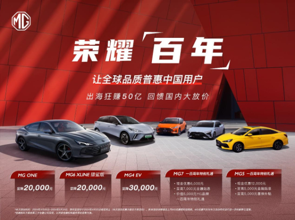 此次“荣耀百年”回馈活动, 全球首款电动钢炮MG4 EV官方直降3万元,品质潮玩SUV MG ONE和潮能玩家之选MG6 XLINE猎鲨版官方直降2万元,至美B级轿跑MG7一百周年特别礼遇1.8万元,MG5一百周年特别礼遇2.2万元。