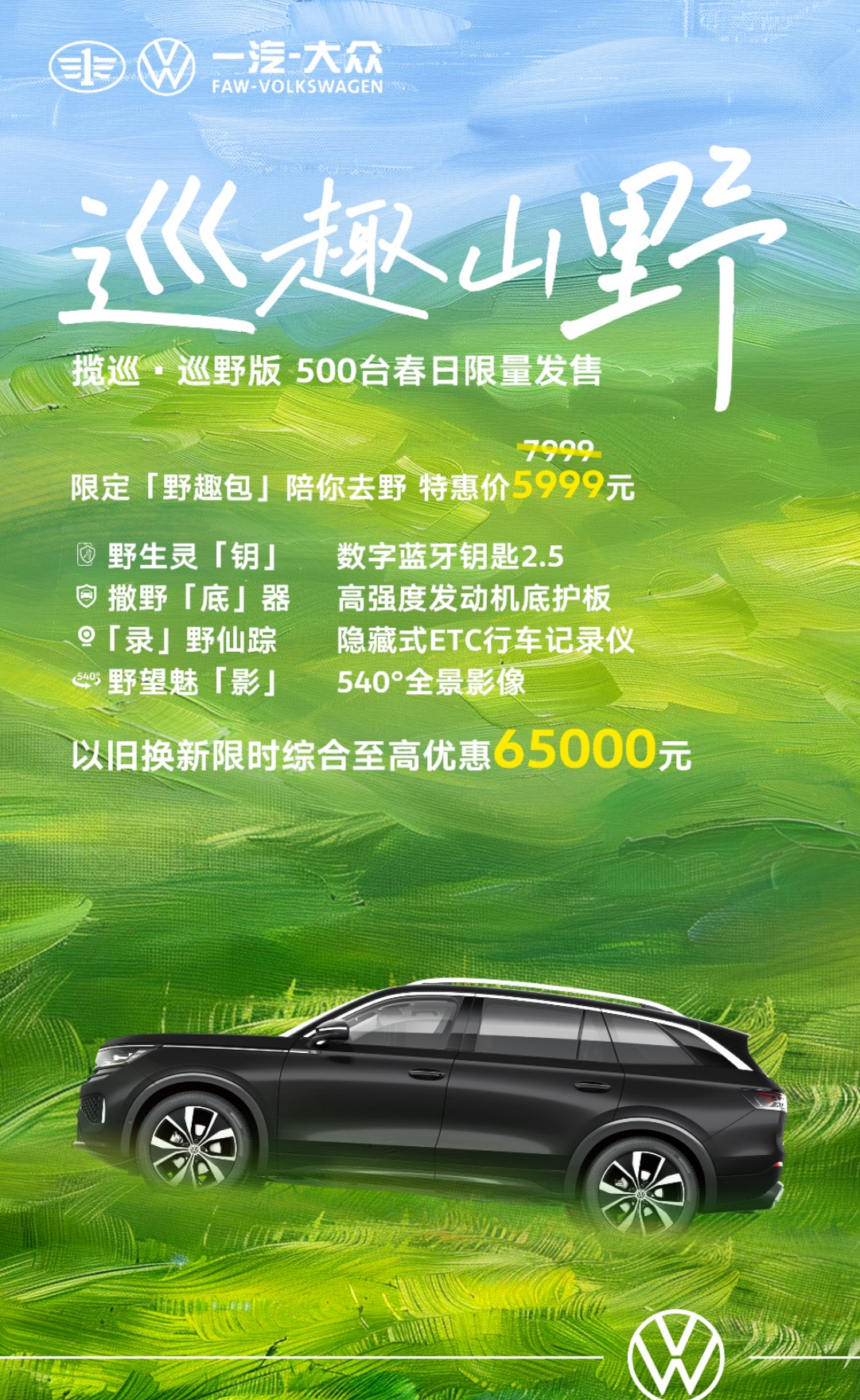 揽巡·巡野版现已上市,接受在线下订,数量有限,先到先得;而为了让用户更轻松愉悦地拥有爱车,一汽-大众还推出了以旧换新综合优惠至高65000元等多重限时优惠。一汽-大众期待与每一位热爱户外的用户共同开启春日之旅,一起享受户外新体验。