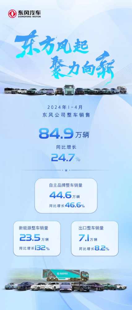 随着新技术的推广应用与新车型的陆续投放,东风汽车迎来稳健上扬的发展势头。今年1-4月,东风汽车整车销量84.9万辆,同比增长24.7%。其中,自主品牌整车销量44.6万辆,同比增长46.6%;新能源整车销量23.5万辆,同比增长132%。