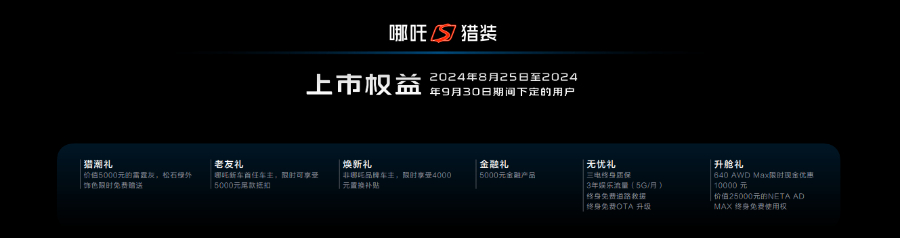哪吒汽车还为购车者提供多项权益。即日起至2024年9月30日,哪吒汽车为首批哪吒S猎装支付大定的用户推出限时购车礼遇。