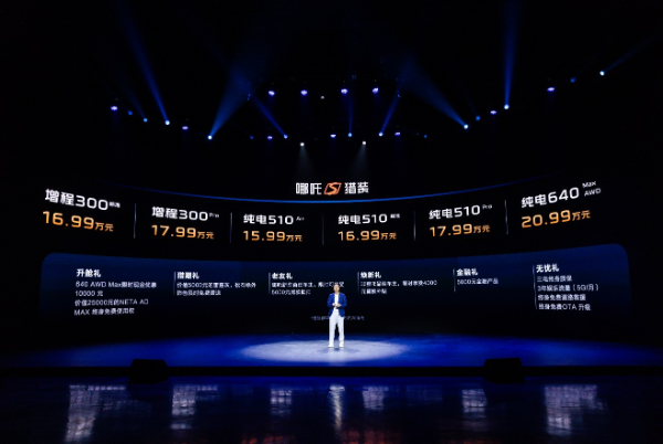 8月25日,哪吒S猎装正式上市,新车六个版本,包含纯电和增程,价格区间为15.99万元-20.99万元。增程版共推出两款车型:16.99万元的增程300标准版、17.99万元的增程300 Pro版。纯电版共推出四款车型,15.99万元的510 Air版,16.99万元的纯电510标准版和17.99万元的纯电510 Pro版,以及20.99万元的640 AWD Max版。此外,全球首搭宁德时代一体化智能底盘的CIIC 800V版也正式开启预售,预售价为18.99万元起。