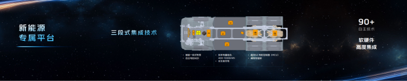 欧曼银河9是油气氢电混多技术路线,其专属的新能源平台,采用创新的三段式集成技术,拥有超过90项自主技术,实现高效轻量化电驱桥、全域高效碳化硅控制模块、多种电量组合和兆瓦级充电技术、智能一体化热泵技术、自主8合1电控技术等软硬件高度集成。针对燃油/气车平台,欧曼银河9也实现了全面的迭代进化,匹配了最新升级的第五代超级动力链,首次采用VCU实现对发动机和变速箱的中央管理,油/气耗比现有平台降低5%;同时采用全新电气架构,率先在商用车行业里应用百兆以太网,传输速率是现有平台的200倍,可充分满足自动驾驶和智能座舱大数据传输需求。