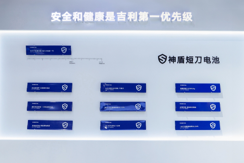 在自研电池上,吉利推出了超安全、超耐用、超快充的神盾短刀电池,目前已在银河E5上率先应用。神盾短刀电芯长度580mm,能量密度192Wh/kg,拥有3500圈循环寿命,平均充电倍率2.45C,10%-80%SOC充电时间仅需17分钟。经过实测,神盾短刀电池包在完成921次的完整充放电耐久测试之后,依然拥有90.5%的健康度。