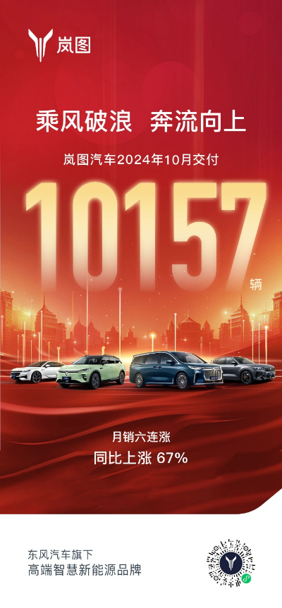11月1日,岚图汽车公布2024年10月交付数据。10月,岚图汽车交付新车10157辆,连续两月销量破万,1-10月,岚图汽车累计交付62705辆,同比增长87%。面对激烈市场竞争,岚图汽车以强大体系力破局,发挥自主创新的强大势能,月销实现“六连涨”。