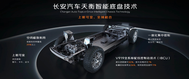 在底盘设计方面,长安凯程依托长安汽车天衡智能底盘技术,实现了底盘“上装可变、全域融合”的技术特点。通过打破上下车体布置边界,使得空间得到充分利用,产品装载利用率最高可达25%以上。通过线控转向、制动、悬架的一体化集中控制,最大限度实现商用车安全性、稳定性。例如,长安凯程V919全系标配线控制动技术(IBCU),建压速度提升50%,刹车距离优化7%,能量回收效率达26%。