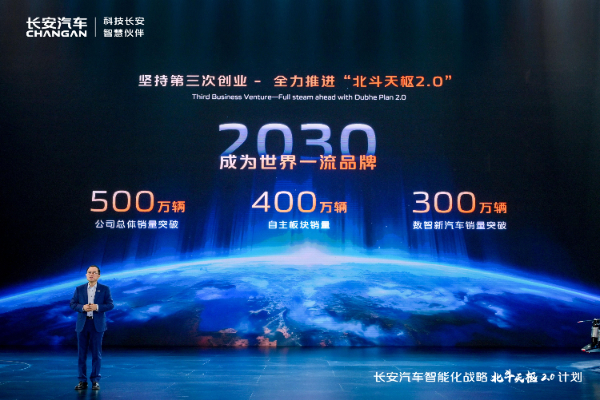 面向未来,长安汽车始终坚持第三次创业——创新创业计划,全力推进“北斗天枢2.0”计划,力争到2030年,公司总体销量突破500万辆,其中,自主板块销量400万辆,数智新汽车销量突破300万辆,成为世界级品牌。