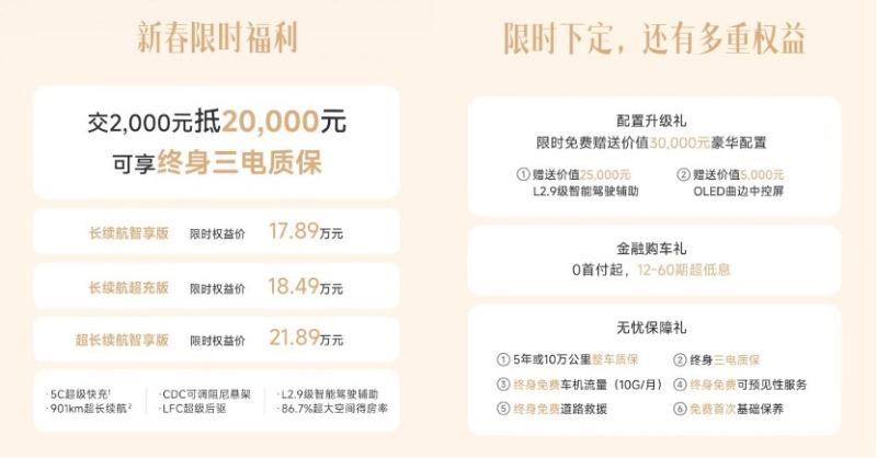 据悉,2月28日前下定岚图知音,用户还能享受“2000元抵20000元”的福利政策,17.89万起的价格就能入手。在此基础上,岚图知音官方还推出包括终身三电质保的三大购车好礼。同时,还能叠加2025年国补政策。