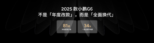 小鹏G6为追求极致科技的年轻用户量身打造,凭借全场景智能驾驶辅助系统、全域800V高压SiC碳化硅平台、12000T前后一体式压铸技术、CIB电池车身一体化技术等,开创了新能源的智能平权,上市后累计销量近100000台。2025款小鹏G6,带来了多达81项的体验更新升级,高达34%的一级总成件焕新。