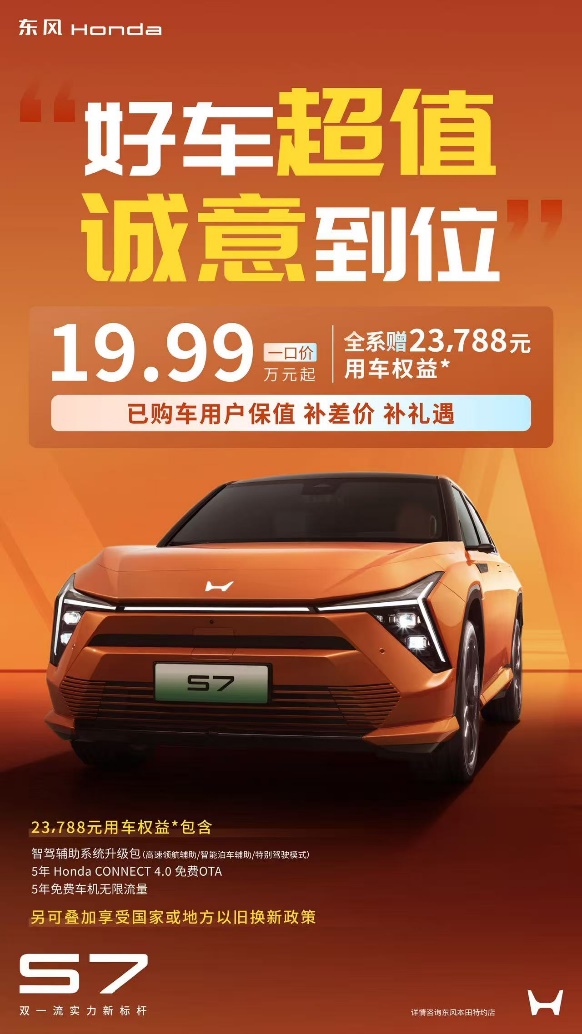 2025年,中国汽车消费市场春季遇“暖”,消费者购车热情高涨,众多车企也推出多种优惠政策,以出众的产品品质和充满诚意的价格,为用户带来更具质价比的好车,让卓越品质赋能更多美好出行体验。4月15日晚,东风本田官方渠道公布,本田首款纯电高端SUV东风本田S7正式推出“好车超值,诚意到位”的“一口价”:19.99万元-24.99万元,以及提供高达23,788元的用车权益,包含智驾辅助系统升级包、5年Honda CONNECT4.0免费OTA、5年免费车机无限流量。东风本田还将提供已购车用户保值政策:凡调价前购买东风本田S7的用户,后续将获得补差价和补礼遇。
