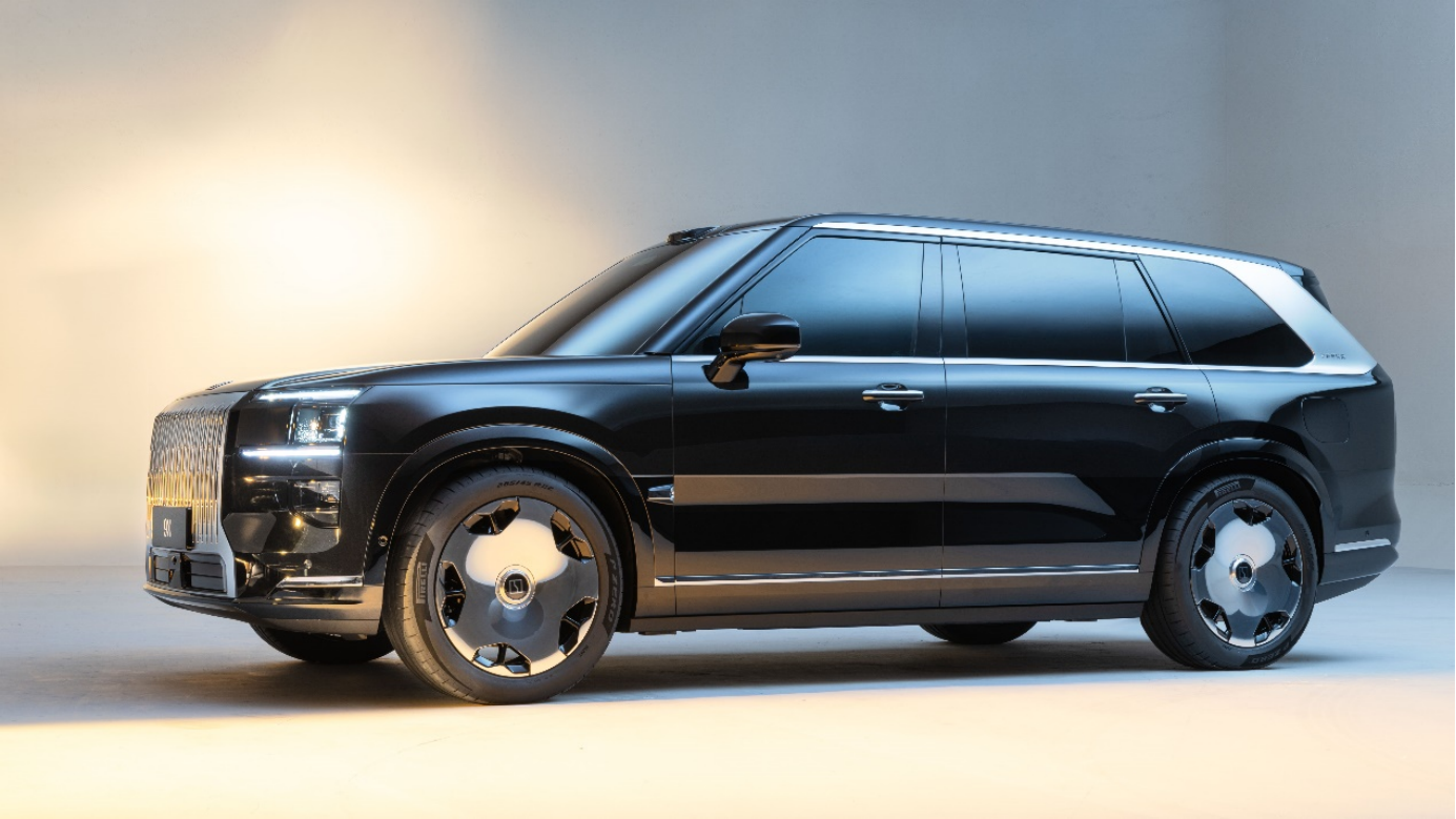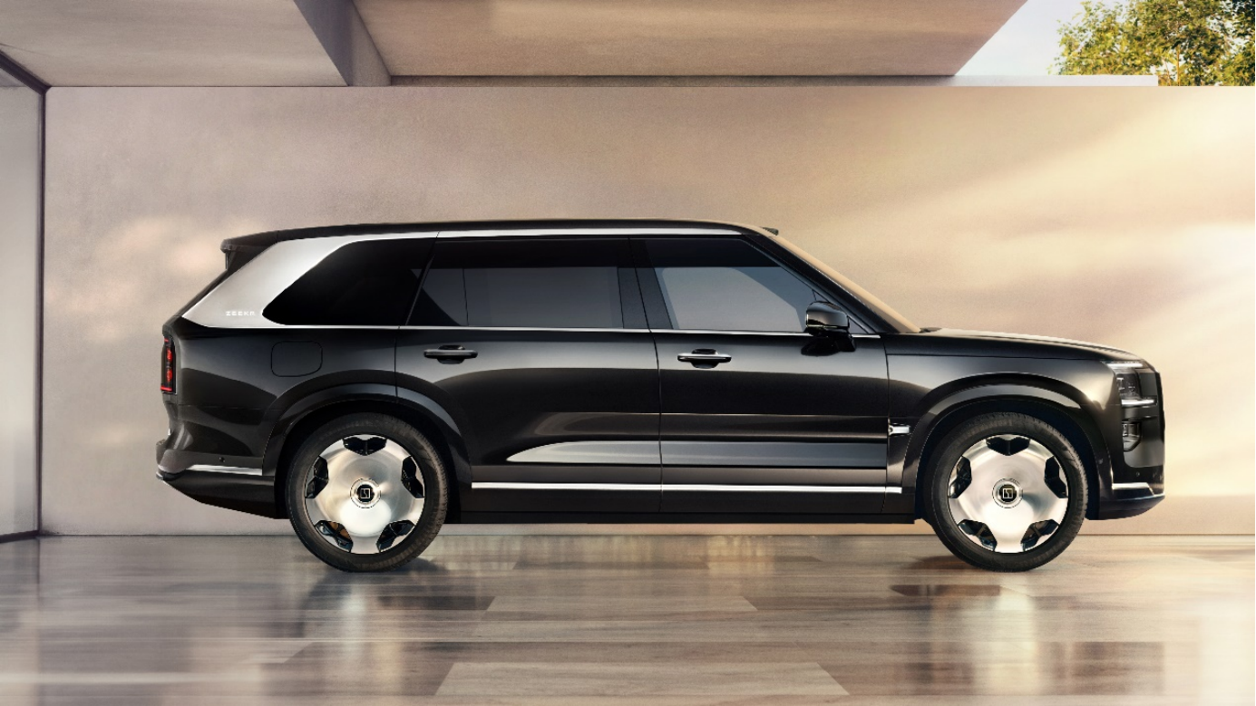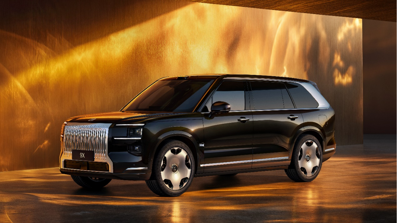 极氪9X的车长超过5.2米,车宽超过2米,车高超过1.8米,轴距接近3.2米,庞大的体态带来了绝对的存在感和体量感。为了平衡庞大力量与典雅格调,设计上着重于高车顶、大轮毂和宽敞车门的和谐比例。