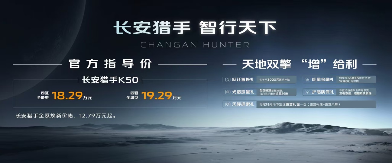 长安猎手K50四驱全域型,让远方没有边界,官方指导价19.29万元;长安猎手K50四驱全能型,把科技带入日常,官方指导价18.29万元。