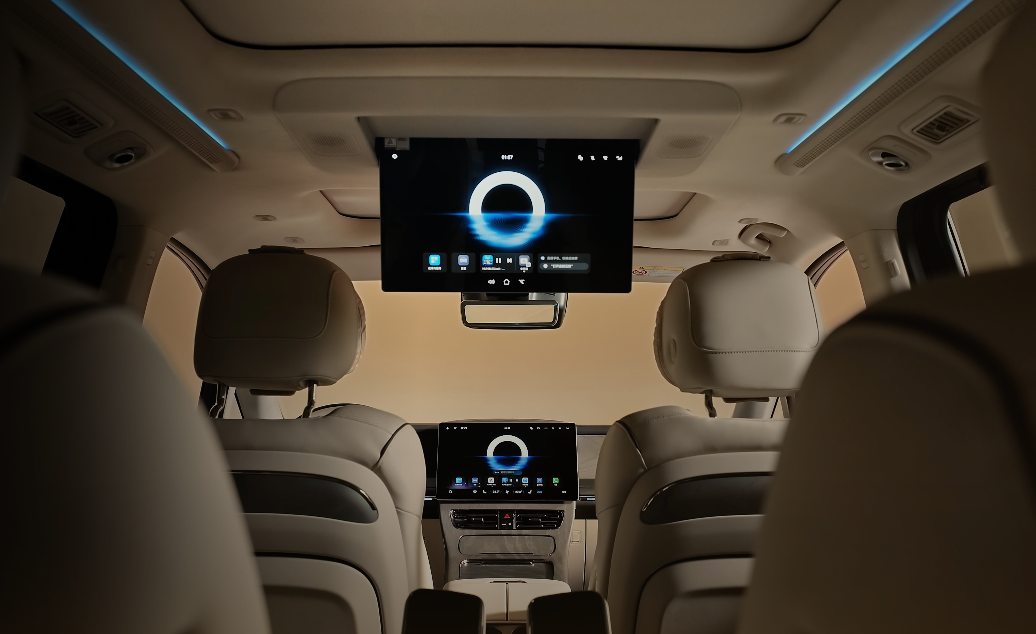 鸿蒙座舱支持手机应用全量上车,可跨多种设备的深度协同,配合15.6 英寸中控屏、12.3英寸仪表盘、17.3英寸3K分辨率高清吸顶屏、双侧5英寸扶手屏、流媒体后视镜,以及G-link 副驾屏平板组成7屏互联,实现全场景智能交互。