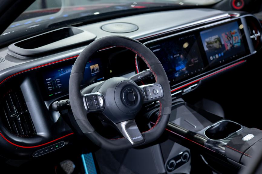 BRABUS同样代表着不设限的极致豪华。迈巴赫同款超感无框电吸门和细腻柔软的超纤绒顶棚,以及全球首搭的森海塞尔典范音响系统,进一步提升了#5 BRABUS超能版的豪华氛围;而梅赛德斯-奔驰全球设计团队量身打造的256色氛围灯,支持音乐律动、开门氛围灯警示、温度调节联动、驾驶模式联动等多种模式,为全新#5 BRABUS超能版增添了更多个性化的潮流色彩。