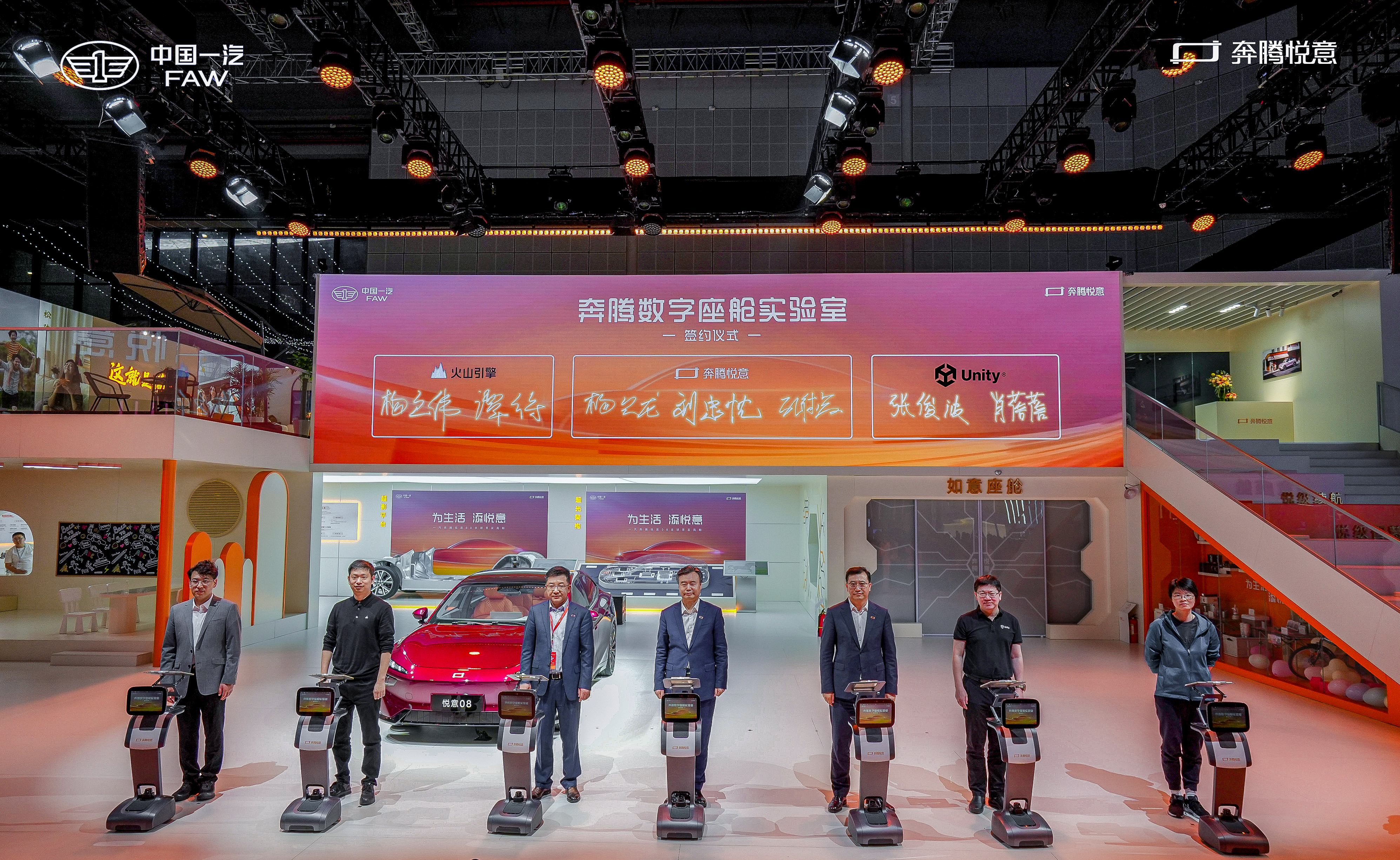 传承一汽70余年造车底蕴,基于一汽奔腾自主创新研发实力,以及生态链合作伙伴协同共创的聚合效应,奔腾悦意不断丰富技术储备、扩充未来出行生态。车展发布会现场,一汽奔腾还正式与火山引擎和Unity签约,联合成立数字座舱实验室,为进一步提升未来出行体验做足准备。
