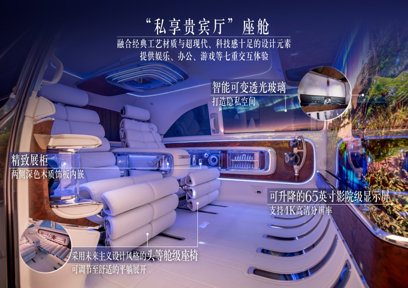 Vision V概念车重新定义豪华空间,营造“私享贵宾厅”般的座舱体验。智能可变透光玻璃将乘客舱与驾驶舱分隔,可在毫秒间实现透明度的无级调节,营造自由、私密的驾乘空间。水晶白色Nappa皮饰与白色丝光绸缎,和大面积开孔胡桃木饰件形成鲜明对比,格调优雅。头等舱级座椅灵感源自优雅经典的休闲躺椅,采用未来主义设计风格,多种调节模式为乘客提供极致呵护,甚至可调节至舒适的平躺展开。两侧木质饰板内嵌精致展柜,为个人物品提供收纳空间,双独立座椅之间的中控台同样设计为精致展柜,集成可折叠桌板,桌板展开后呈现为一块精致的国际象棋棋盘,致敬经典之美。