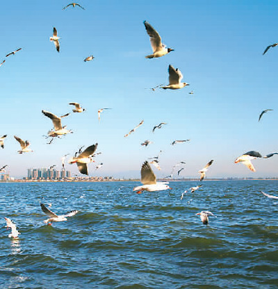 成千上万的红嘴鸥是滇池的主角。飞翔时,它们张开两翼、收紧腹部、挺直双脚,身体平滑如流水般向前,动作之流畅自如恐怕再高明的飞机设计师都自叹不如。它们时而在空中盘旋,时而俯冲湖面,当翅膀飞速掠过水面后,又猛然变向,像箭一般飞上天空,形成一条优美的弧线,犹如进行一场空中芭蕾舞表演。不知谁在引导,每隔数分钟鸟儿会有一次集体起飞,“嘎、嘎、嘎”声齐鸣,毫不贪恋身边的海鸥粮,往同一个方向百米冲刺、盘旋、返回。