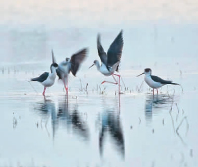 沿着观鹤台向西南的康西草原眺望,能看到在水中踱步的黑翅长脚鹬、草中躲藏的扇尾沙锥、凤头麦鸡驱赶着进入领地的喜鹊、赤嘴潜鸭在水里浮潜、芦苇里蹦蹦跳跳的文须雀,在水边两侧的柳树上,还可以见到中华攀雀夫妇共筑爱巢。