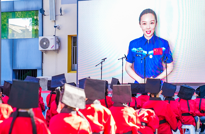 活动上,航天员王亚平发来视频寄语,她表示在收到并阅读《福娃的航天梦》一书后深受感动,希望同学们在新的学期勇于面对新的机遇与挑战,勤奋学习,不断进步,让心中梦想的种子生根发芽,长大后为祖国的航天事业添砖加瓦。