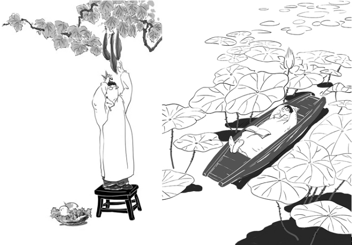 绿叶扶红花,雅阁、秋雨为这本书的配图也颇有特色。随笔《理想与乡愁》的封面,是一位戴着眼镜、长相酷似作者的文人站在小凳子上,准备将挂在枝头的丝瓜摘下来以供午餐之需,脚旁一只狗狗看守着筐子里的两个大水萝卜。这幅图与左面的书名遥相呼应:作者的“理想”与“乡愁”就在丝瓜藤下结为了一体。诗集《人生归处是田园》的封面是三株树下,那位戴眼镜的文人坐在长椅上,望着右面空椅子上的三只小鸟,一付若有所思的样子;而叶廷芳为诗集所写序言文末的尾花,还是这幅图,只不过沿纵轴转动180°——文人从右面望向左面。一里一外两幅画互为镜像,似乎是暗示人们,艺术就是社会生活既真实又不完全一样的反映。