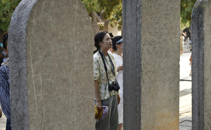 8月7日,游人在嵩阳书院内参观“大唐嵩阳观纪圣德感应之颂碑”。
