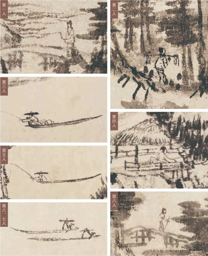 说第九位人物之前,我们先来看看上图展示的已经形成共识的八位人物。从形象上看,这八位人物大概为高士、樵夫和渔父。详细解读这八位人物之前,我们不妨先一起找寻一下隐藏的第九位神秘人物。