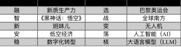 “新质生产力”,坚持“稳”中求进,“数字化转型”,应对“变”局挑战。12月9日,“汉语盘点2024”年度各组前五位字词正式出炉,“融”“智”“选”“战”“新质生产力”“数字化转型”“全球南方”“大语言模型(LLM)”等热门字词入围。最终结果将于12月20日“汉语盘点2024”揭晓仪式上发布。