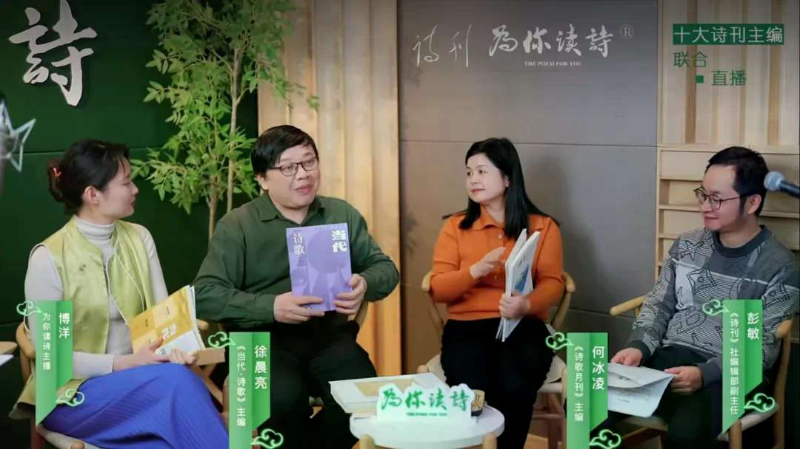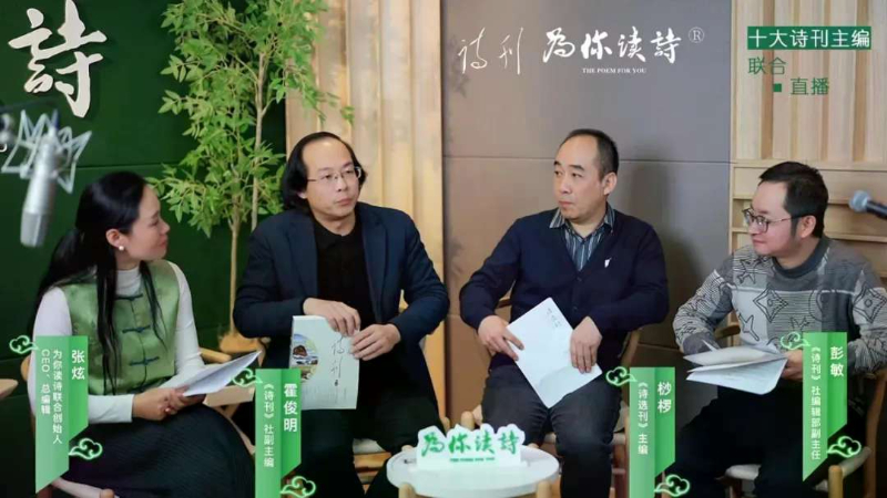 2024年12月30日,由《诗刊》社和“为你读诗”策划和发起,联合《星星》诗刊、《扬子江诗刊》《诗选刊》《诗歌月刊》《当代·诗歌》《江南诗》《诗潮》《诗林》《草堂》诗刊举办的“一行诗能使我们沉醉——十大诗刊主编联合直播”举行,意在传递诗歌的文化价值,探讨其在新时代的传播与创新。直播由《诗刊》社编辑部副主任彭敏,“为你读诗”联合创始人、CEO、总编辑张炫,“为你读诗”主播博洋主持。